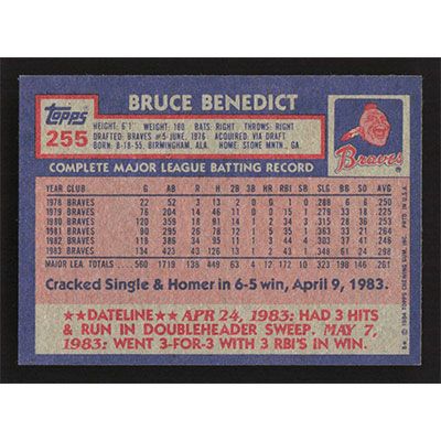 This is a 1984 Topps Bruce Benedict autographed baseball card. This card has been signed, in blue, by Bruce Benedict, and is guaranteed authentic by Ballcardz.com. The card is #255 and pictures show condition.