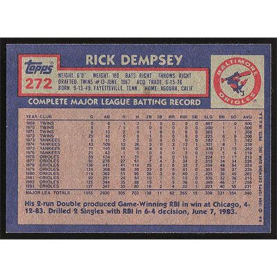 This is a 1984 Topps Rick Dempsey baseball card. The card is #272 and pictures show condition.
