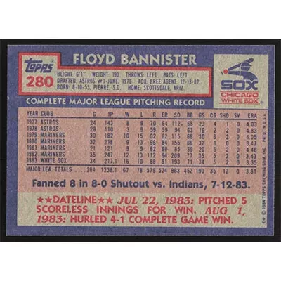 This is a 1984 Topps Floyd Bannister baseball card. The card is #280 and pictures show condition.