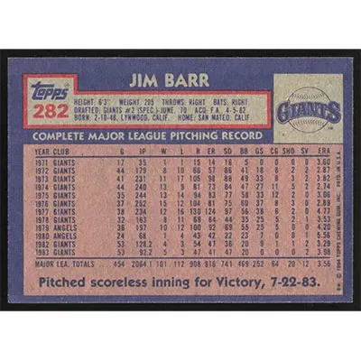This is a 1984 Topps Jim Barr baseball card. The card is #282 and pictures show condition.