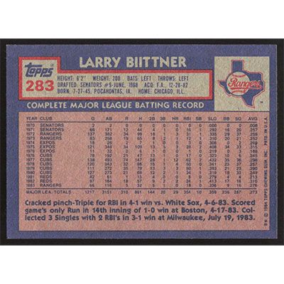 This is a 1984 Topps Larry Biittner baseball card. The card is #283 and pictures show condition.