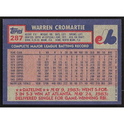 This is a 1984 Topps Warren Cromartie baseball card. The card is #287 and pictures show condition.
