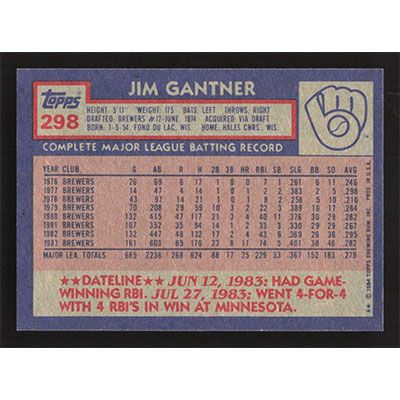 This is a 1984 Topps Jim Gantner baseball card. The card is #298 and pictures show condition.