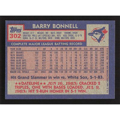 This is a 1984 Topps Barry Bonnell baseball card. The card is #302 and pictures show condition.