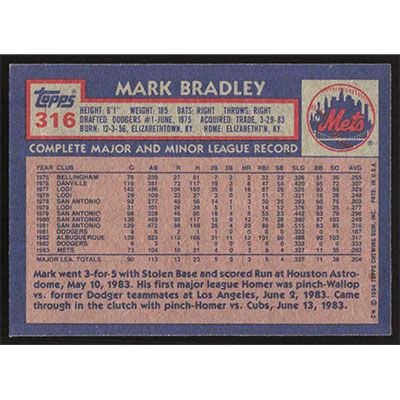 This is a 1984 Topps Mark Bradley baseball card. The card is #316 and pictures show condition.