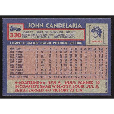 This is a 1984 Topps John Candelaria autographed baseball card. This card has been signed, in blue, by John Candelaria, and is guaranteed authentic by Ballcardz.com. The card is #330 and pictures show condition.