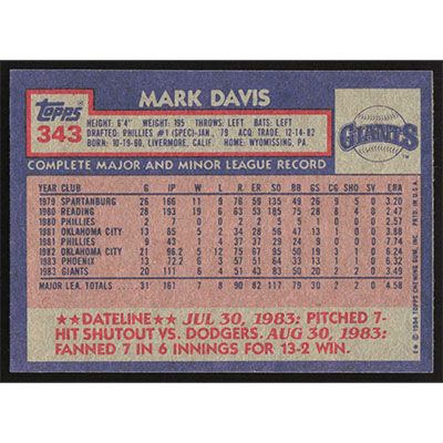 This is a 1984 Topps Mark Davis baseball card. The card is #343 and pictures show condition.