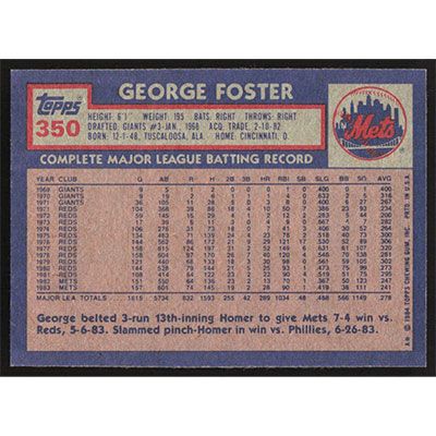 This is a 1984 Topps George Foster baseball card. The card is #350 and pictures show condition.