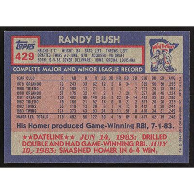 This is a 1984 Topps Randy Bush baseball card. The card is #429 and pictures show condition.