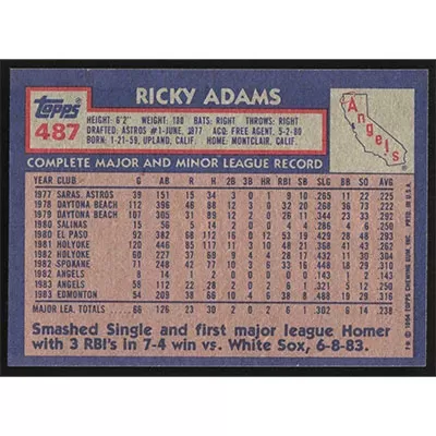 This is a 1984 Topps Ricky Adams baseball card. The card is #487 and pictures show condition.
