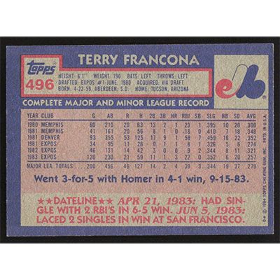 This is a 1984 Topps Terry Francona baseball card. The card is #496 and pictures show condition.