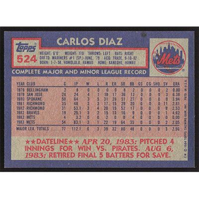 This is a 1984 Topps Carlos Diaz baseball card. The card is #524 and pictures show condition.