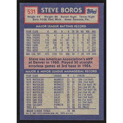 This is a 1984 Topps Steve Boros baseball card. The card is #531 and pictures show condition.