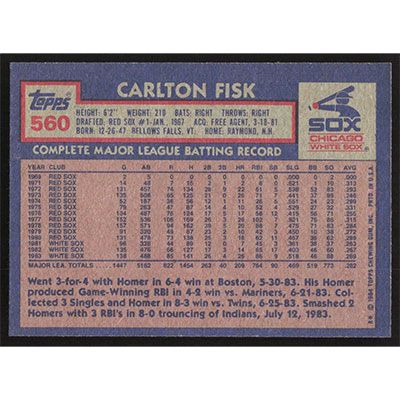 This is a 1984 Topps Carlton Fisk baseball card. The card is #560 and pictures show condition.