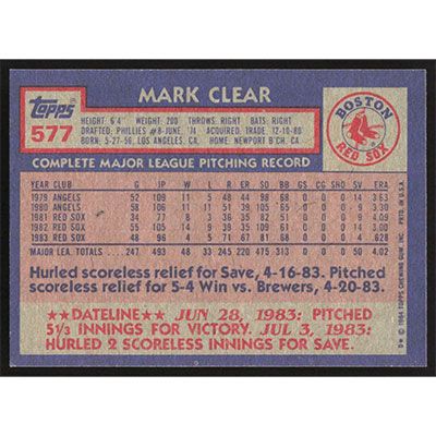 This is a 1984 Topps Mark Clear baseball card. The card is #577 and pictures show condition.