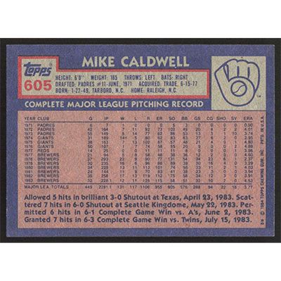 This is a 1984 Topps Mike Caldwell baseball card. The card is #605 and pictures show condition.