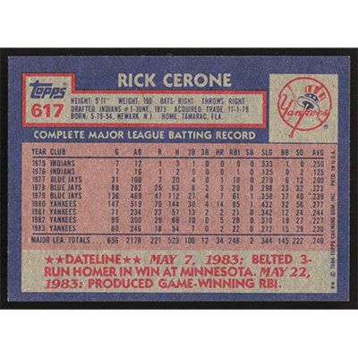This is a 1984 Topps Rick Cerone baseball card. The card is #617 and pictures show condition.