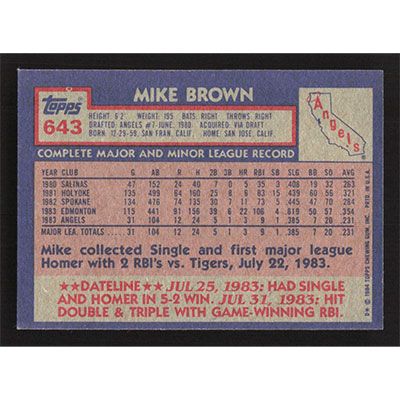 This is a 1984 Topps Mike Brown baseball card. The card is #643 and pictures show condition.
