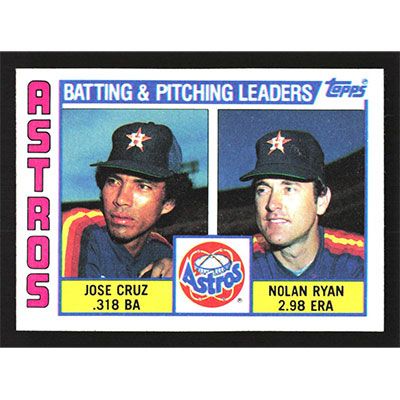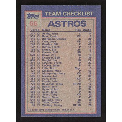 This is a 1984 Topps Jose Cruz/Nolan Ryan Team Leaders Checklist baseball card. The card is #66 and pictures show condition.