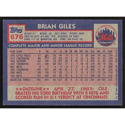 This is a 1984 Topps Brian Giles baseball card. The card is #676 and pictures show condition.