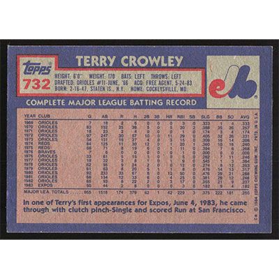 This is a 1984 Topps Terry Crowley baseball card. The card is #732 and pictures show condition.