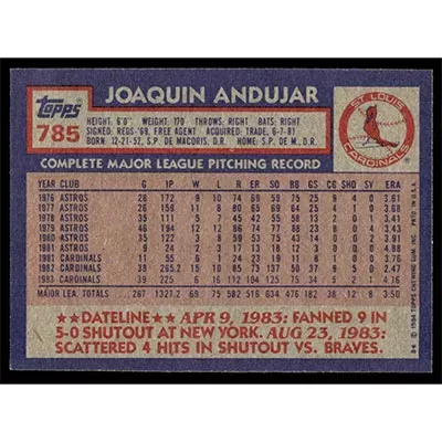This is a 1984 Topps Joaquin Andujar baseball card. The card is #785 and pictures show condition.