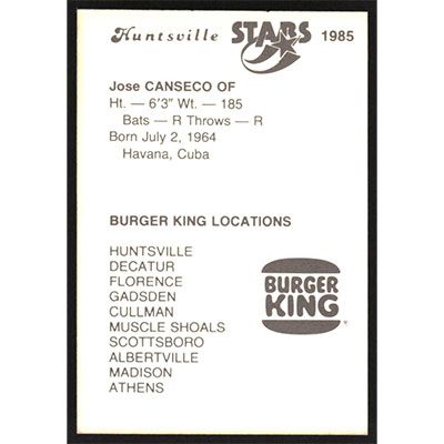 This is a 1985 Burger King Jose Canseco baseball card. The card is #NNO and pictures show condition.