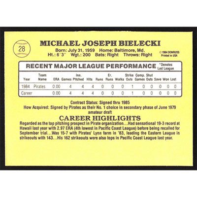 This is a 1985 Donruss Mike Bielecki baseball card. The card is #28 and pictures show condition.