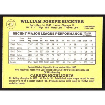 This is a 1985 Donruss Bill Buckner baseball card. The card is #416 and pictures show condition.