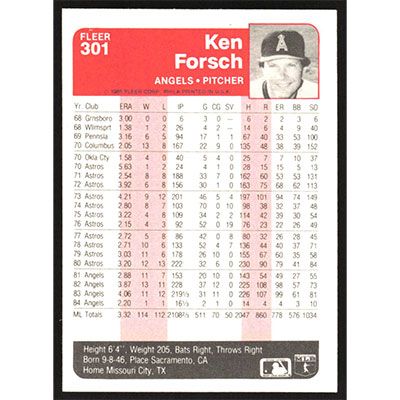 This is a 1985 Fleer Ken Forsch baseball card. The card is #301 and pictures show condition.