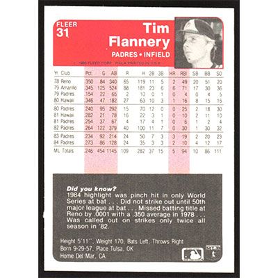 This is a 1985 Fleer Tim Flannery baseball card. The card is #31 and pictures show condition.