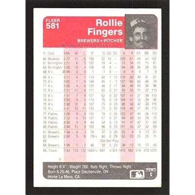 This is a 1985 Fleer Rollie Fingers baseball card. The card is #581 and pictures show condition.