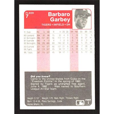 This is a 1985 Fleer Barbaro Garbey baseball card. The card is #7 and pictures show condition.