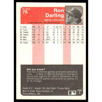 This is a 1985 Fleer Ron Darling baseball card. The card is #76 and pictures show condition.