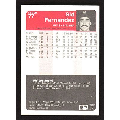 This is a 1985 Fleer Sid Fernandez baseball card. The card is #77 and pictures show condition.