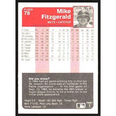 This is a 1985 Fleer Mike Fitzgerald baseball card. The card is #78 and pictures show condition.