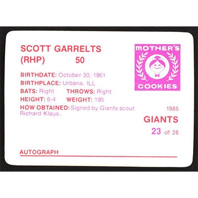 This is a 1985 Mother's Cookies Scott Garrelts baseball card. The card is #23 and pictures show condition.
