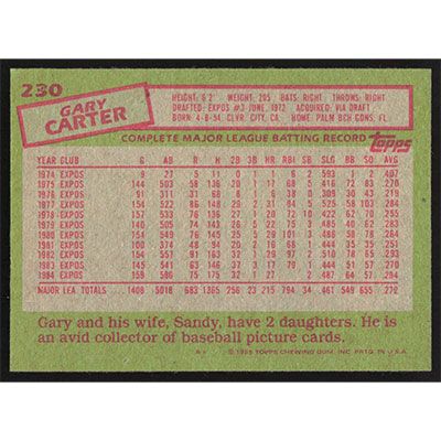 This is a 1985 Topps Gary Carter baseball card. The card is #230 and pictures show condition.