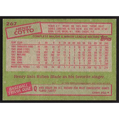 This is a 1985 Topps Henry Cotto baseball card. The card is #267 and pictures show condition.