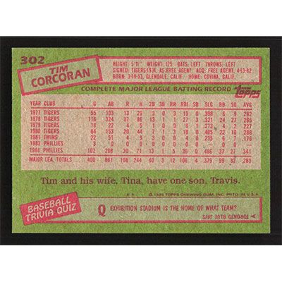 This is a 1985 Topps Tim Corcoran baseball card. The card is #302 and pictures show condition.