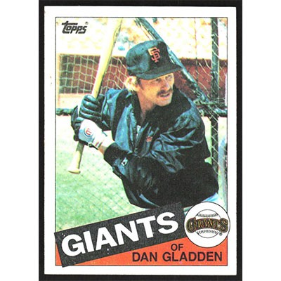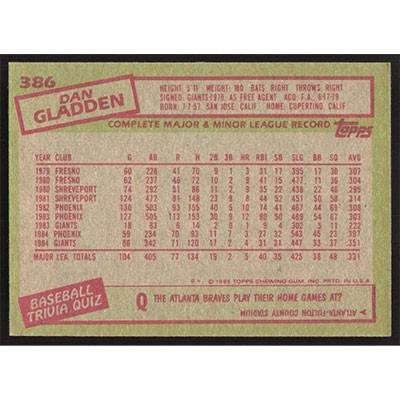 This is a 1985 Topps Dan Gladden baseball card. The card is #386 and pictures show condition.