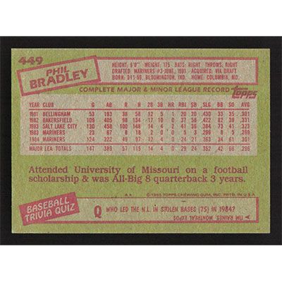 This is a 1985 Topps Phil Bradley baseball card. The card is #449 and pictures show condition.