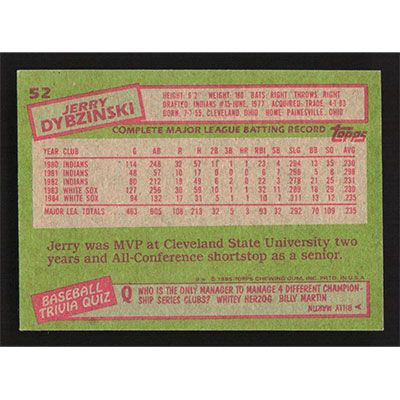 This is a 1985 Topps Jerry Dybzinski baseball card. The card is #52 and pictures show condition.