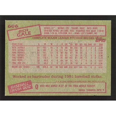 This is a 1985 Topps Rich Gale baseball card. The card is #606 and pictures show condition.