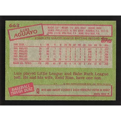 This is a 1985 Topps Luis Aguayo baseball card. The card is #663 and pictures show condition.