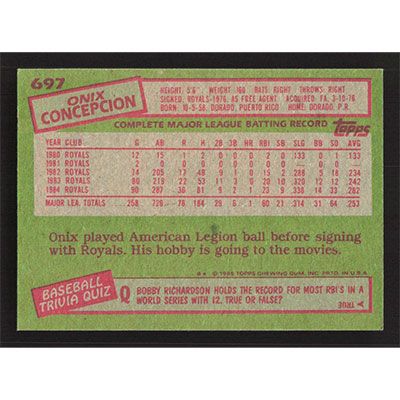 This is a 1985 Topps Onix Concepcion baseball card. The card is #697 and pictures show condition.