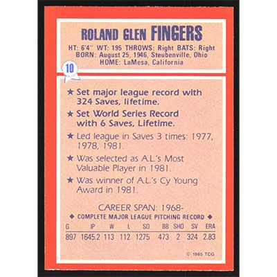 This is a 1985 Woolworth's Topps Rollie Fingers baseball card. The card is #10 and pictures show condition.