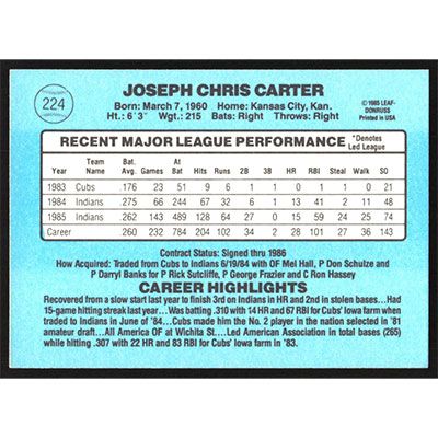 This is a 1986 Donruss Joe Carter baseball card. The card is #224 and pictures show condition.