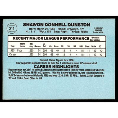 This is a 1986 Donruss Shawon Dunston baseball card. The card is #311 and pictures show condition.