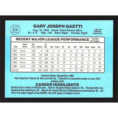 This is a 1986 Donruss Gary Gaetti baseball card. The card is #314 and pictures show condition.